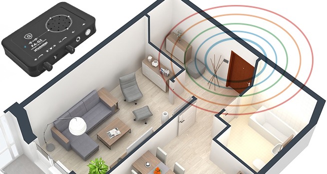 Настраиваемый датчик движения, работающий через стены. Чувствительность встроенного детектора регулируется в диапазоне 1-8 м. Он способен обнаружить движение через любые препятствия (кирпичные, бетонные и деревянные стены, окна), кроме металлических.